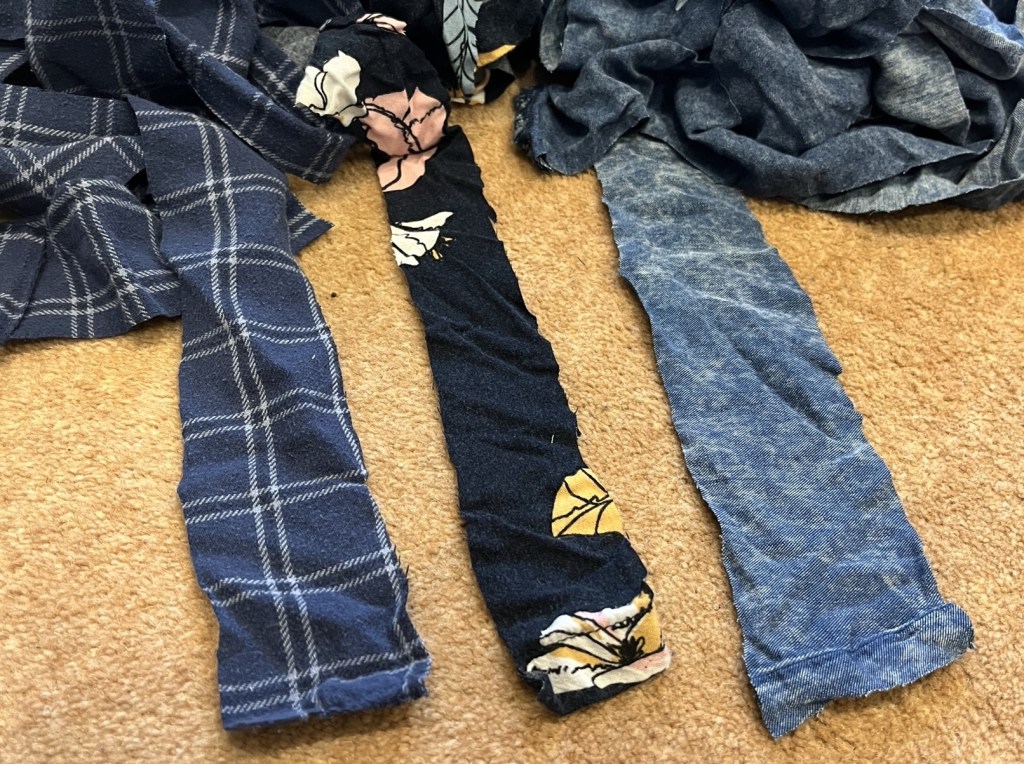 2. Remove the hems from the garments then cut the fabric into 2 inch wide strips.