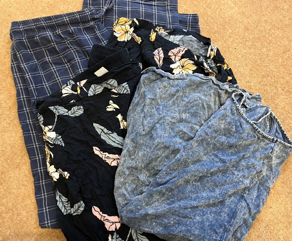 - Fabric: In total I used 6 items of clothing- two pairs of pj bottoms, two dresses, a pair of work trousers and a T-shirt