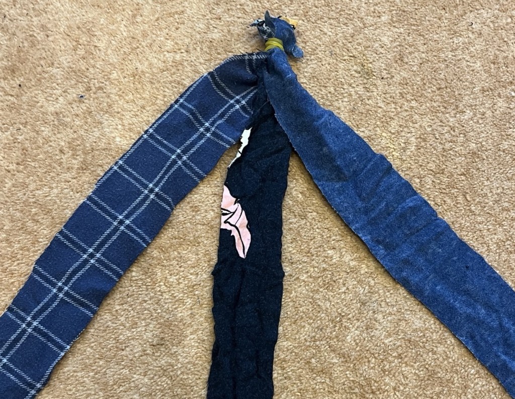 3. Take a strip of each fabric and join the ends together with a knot or elastic band. Then start plaiting the strands together.