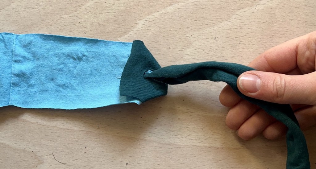 4. Take the non-cut end of the fabric strip that is lying on top and push it up through both slits from back to front.