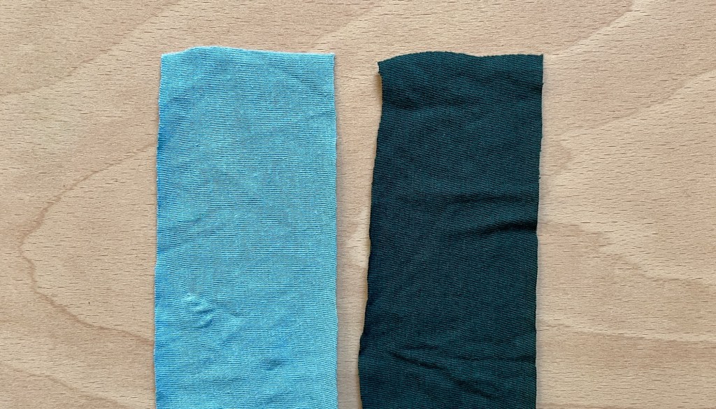 1. Take your two strips of fabric and align the ends you want to join together .