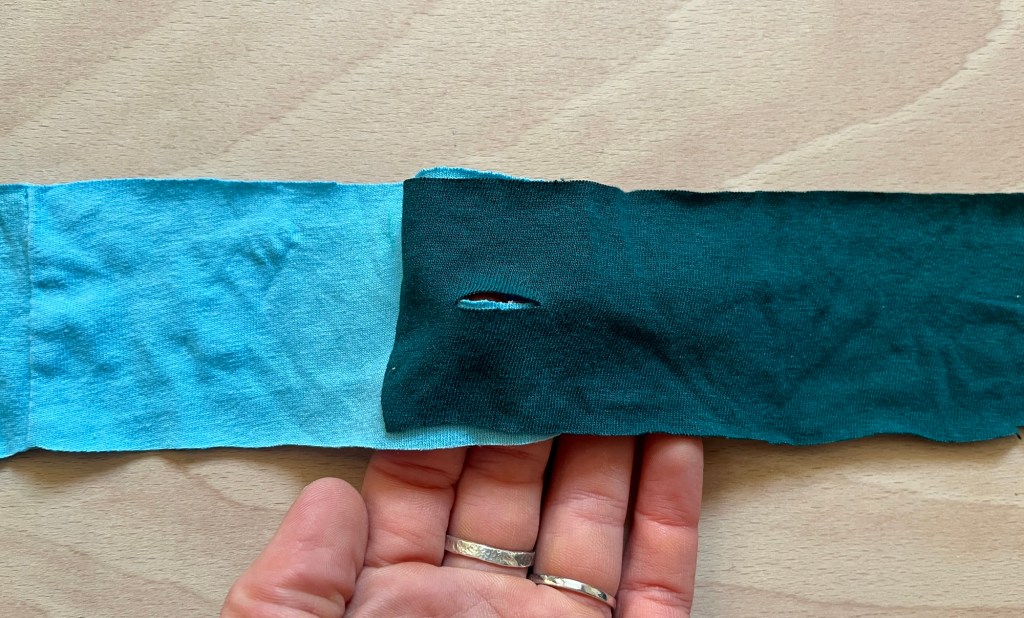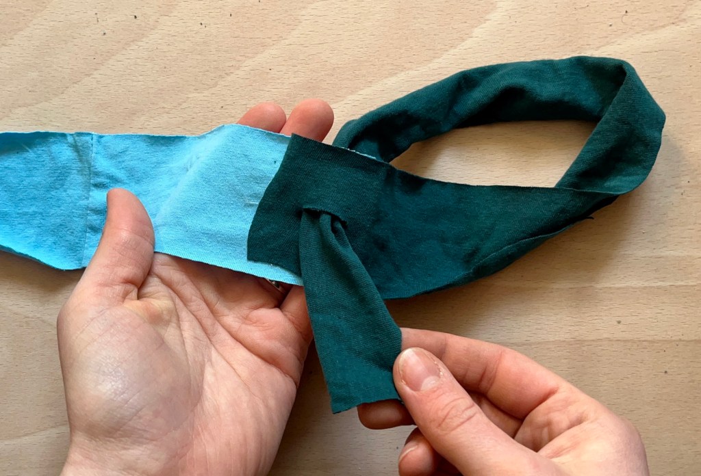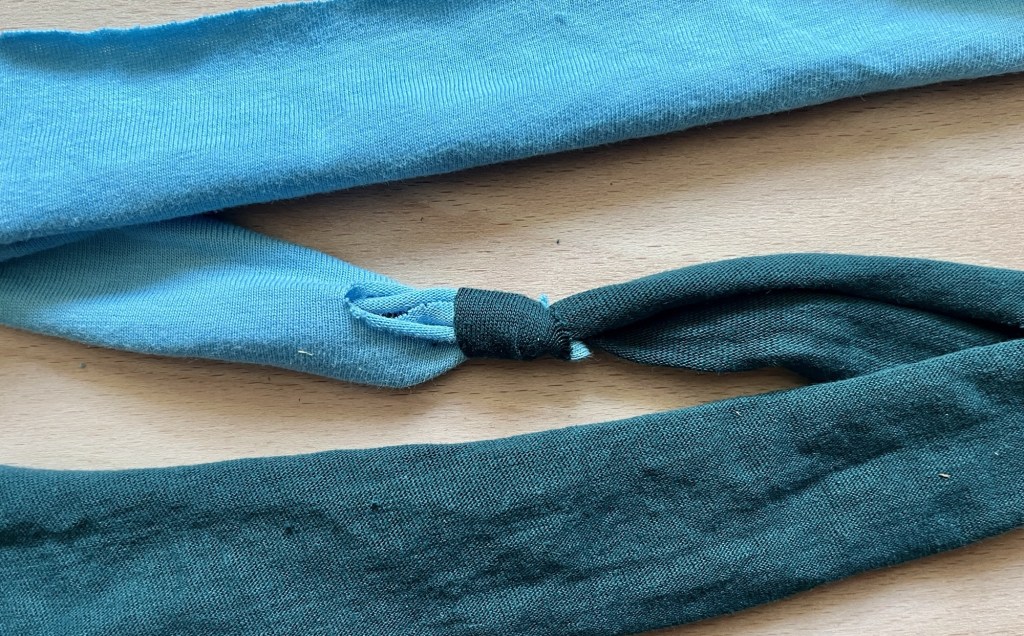 - Knot the smaller strip of fabric onto the longer strip as this will mean pulling less fabric through the cut slits.