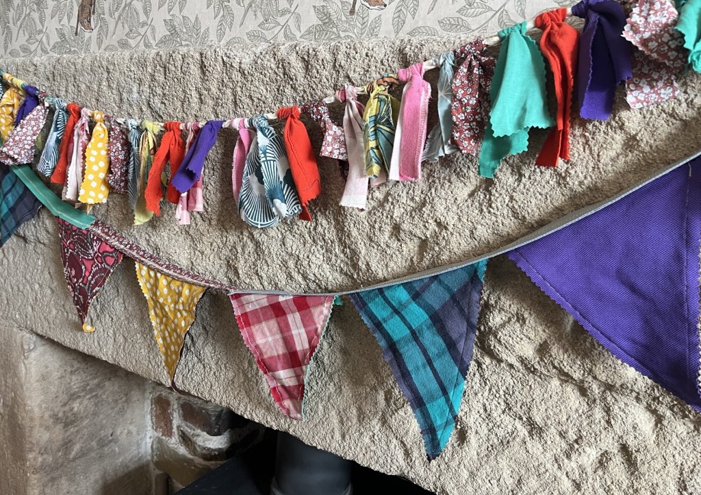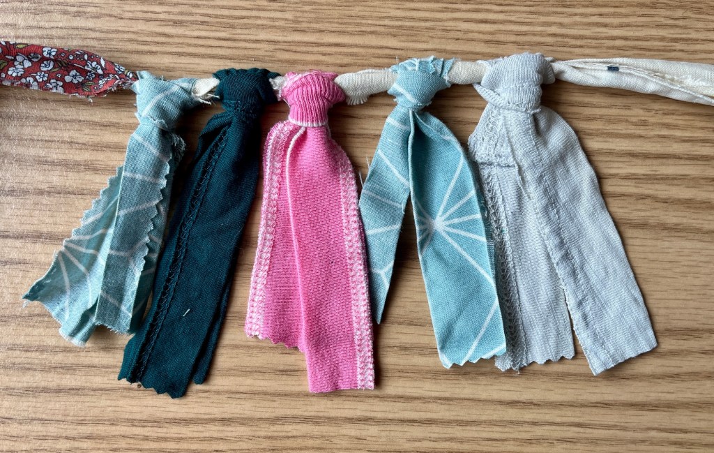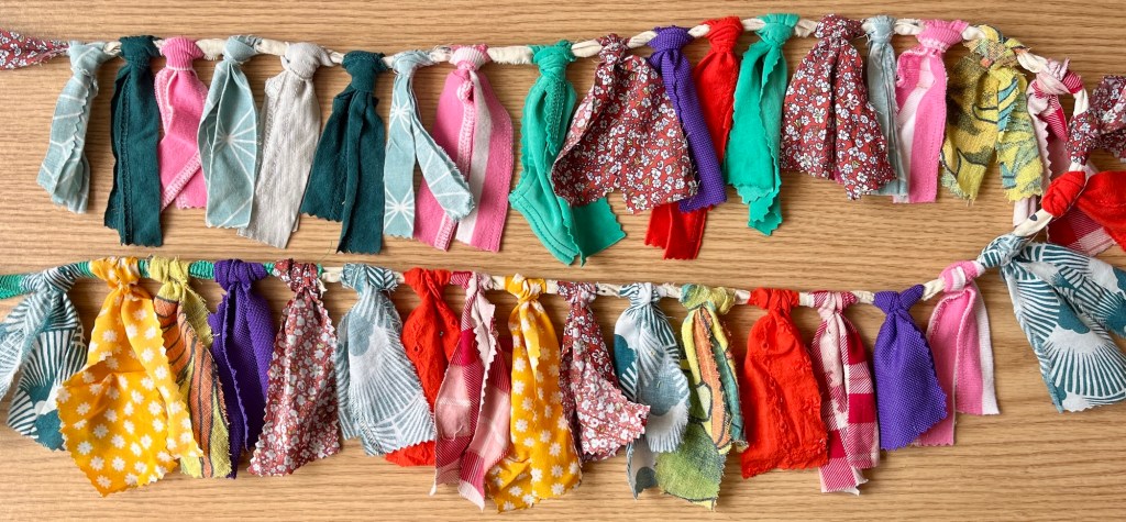 The concept of tying fabric onto string to create a garland is not a new idea however, I wondered if I could alter the pattern slightly so that every element of it, including the string, was made from recycled materials…