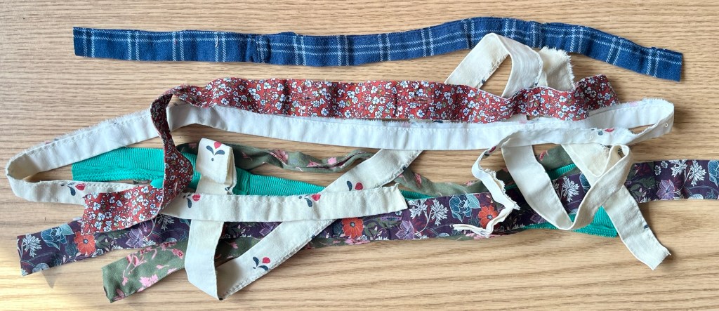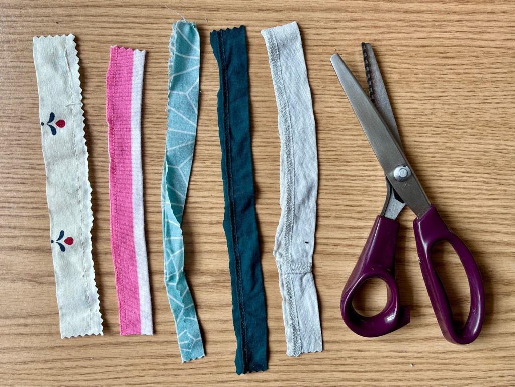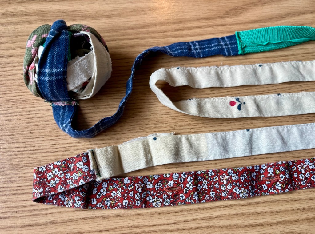 So how did I make my own decorative string? Well, I started by gathering all the hems cut off from various textiles. Fabrics with less stretch such as bed linens, shirts and flannel Pjs I found worked best.